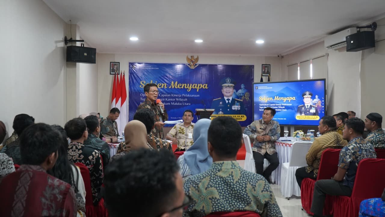 Ternate – Kantor Wilayah (Kanwil) Kementerian Hukum (Kemenkum) Maluku Utara (Malut) mendapatkan momen spesial saat kunjungan Sekretaris Jenderal Kemenkum RI, Nico Afinta. Kedatangan Sekjen didampingi Kepala Pusat Data dan Teknologi Informasi, Rifqi Adrian Kriswanto, Kepala Biro Perencanaan dan Organisasi, Rahmi Widhiyanti, Kepala Biro Keuangan, Sri Yusfini Yusuf, Kepala Biro Barang Milik Negara, Itun Wardatul Hamro dan jajaran.