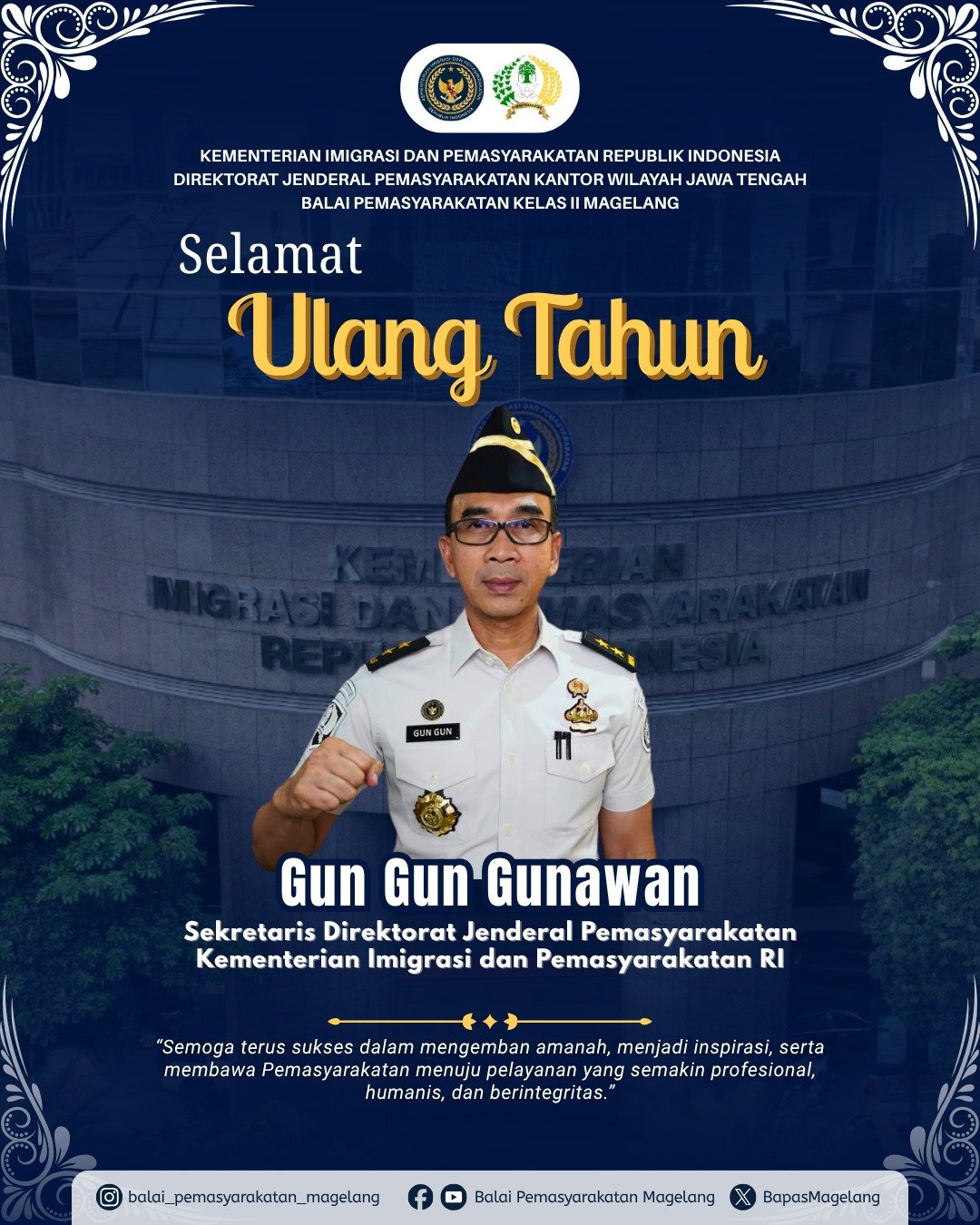Segenap keluarga besar Balai Pemasyarakatan Kelas II Magelang mengucapkan selamat ulang tahun kepada Bapak Gun Gun Gunawan, Sekretaris Direktorat Jenderal Pemasyarakatan Kementerian Imigrasi dan Pemasyarakatan RI. Semoga senantiasa diberikan kesehatan, kebahagiaan, umur panjang, serta keberkahan dalam setiap langkah pengabdian. Semoga terus sukses dalam mengemban amanah, menjadi inspirasi, serta membawa Pemasyarakatan menuju pelayanan yang semakin profesional, humanis, dan berintegritas.