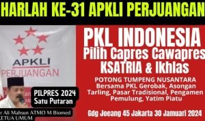Juga sudah jelas pada diri Ketua Umum APKLI Perjuangan melekat sebagai Presiden Kawulo Alit Indonesia (KAI). Jadi siapa paslon pilihan PKL Indonesia sudah jelas juga. Namun akan disampaikan resmi pada Harlah Ke-31 APKLI Perjuangan tanggal 30 Januari 2024 di Jakarta dengan grand tema: “Pilpres 2024 Satu Putaran, PKL Indonesia Pilih Capres Cawapres Ksatria, Tahan Banting dan Ikhlas”.
