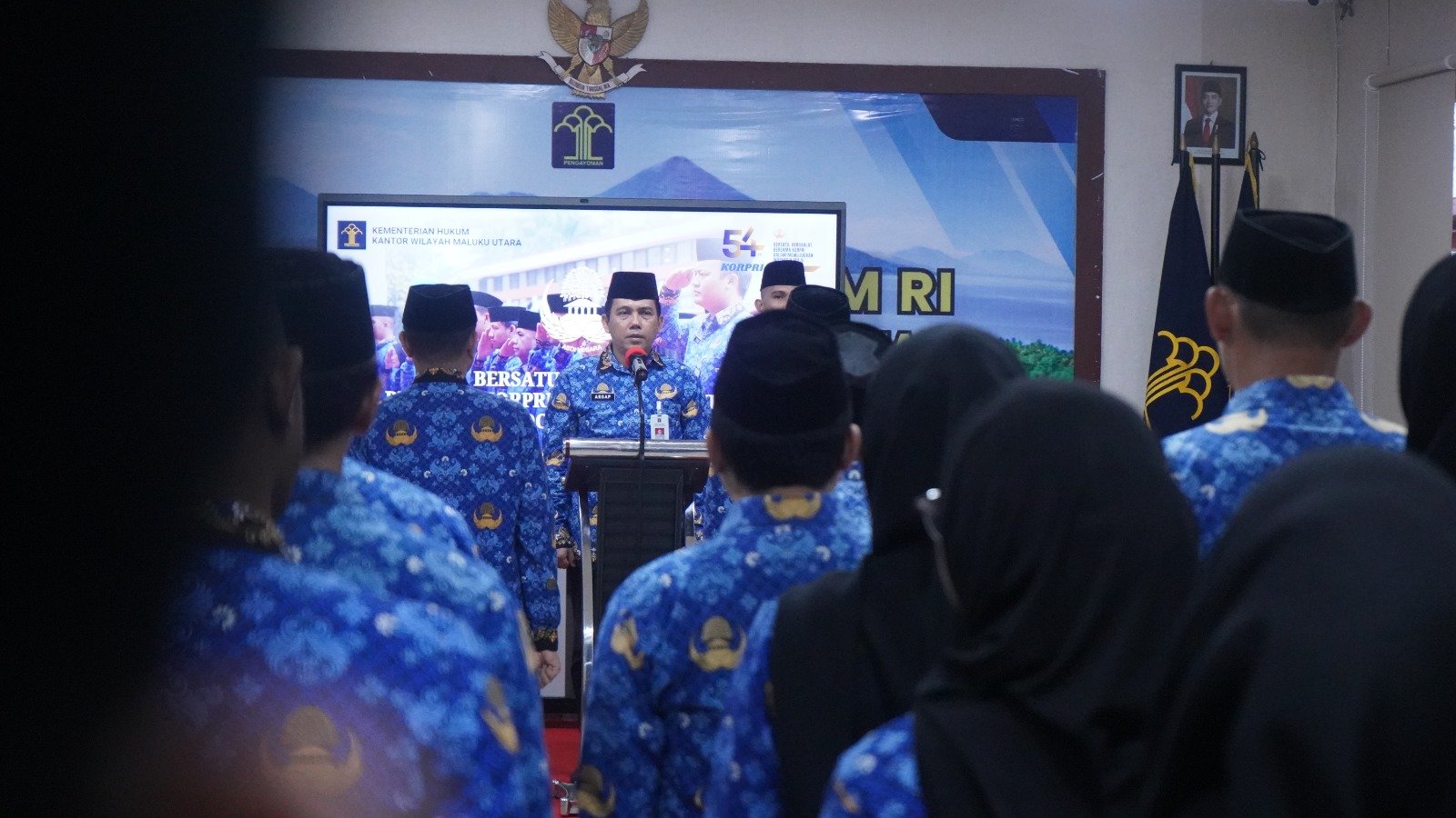 Ternate – Kantor Wilayah (Kanwil) Kementerian Hukum (Kemenkum) Maluku Utara (Malut) menyelenggarakan Upacara Peringatan Hari Ulang Tahun Korpri (KORPRI) ke-54 Tahun 2025 bertajuk “Bersatu Berdaulat, Bersama KORPRI mewudujkan Indonesia Maju” bertempat di Aula Gamala Lantai I Kanwil Malut.