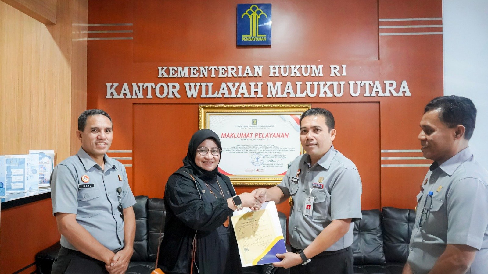 Ternate – Kepala Kantor Wilayah (Kakanwil) Kementerian Hukum (Kemenkum) Maluku Utara (Malut), Budi Argap Situngkir menyerahkan secara langsung surat pencatatan ciptaan Ngale Gahi Puta kepada Anitawati, pemilik hak cipta yang juga CEO Puta Dino Kayangan Tidore.