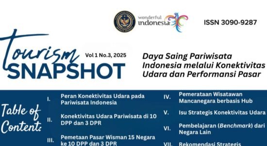 Kementerian Pariwisata (Kemenpar) mempublikasikan kajian terbaru mengenai penguatan pariwisata Indonesia melalui pemanfaatan konektivitas udara dalam publikasi ilmiah Tourism Snapshot Vol. 1 No.