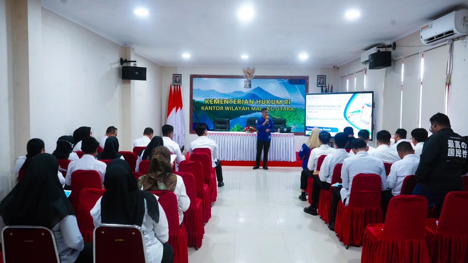 Ternate – Kantor Wilayah (Kanwil) Kementerian (Kanwil Kemenkum) Maluku Utara (Malut) mengikuti kegiatan Sosialisasi Program Jaminan Kesehatan Nasional (JKN) yang diselenggarakan oleh BPJS Kesehatan Cabang Ternate, bertempat di Aula Lantai I Kanwil.