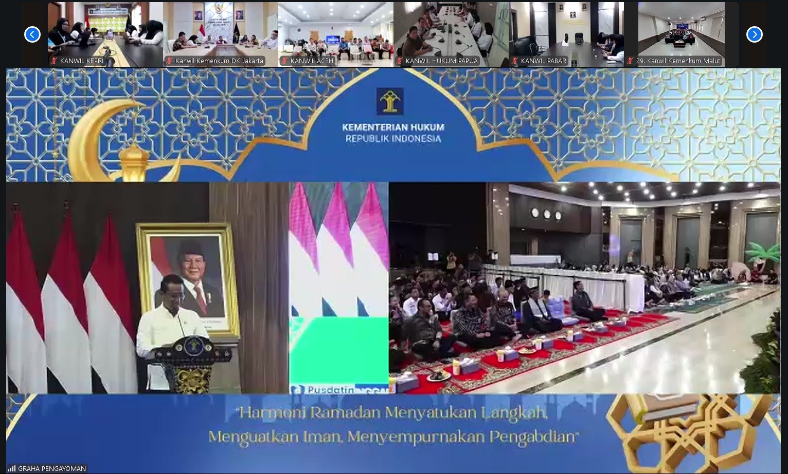 Kamis (12/2), jajaran Kanwil Kemenkum Malut mengikuti kegiatan tersebut melalui tautan Zoom yang telah disediakan, bersama seluruh Kantor Wilayah Kementerian Hukum se-Indonesia. Kegiatan berlangsung dengan rangkaian acara yang mencakup pembukaan, sambutan Menteri Hukum, santunan, tausiyah, serta doa bersama sebagai bentuk persiapan rohani menyambut Ramadhan.