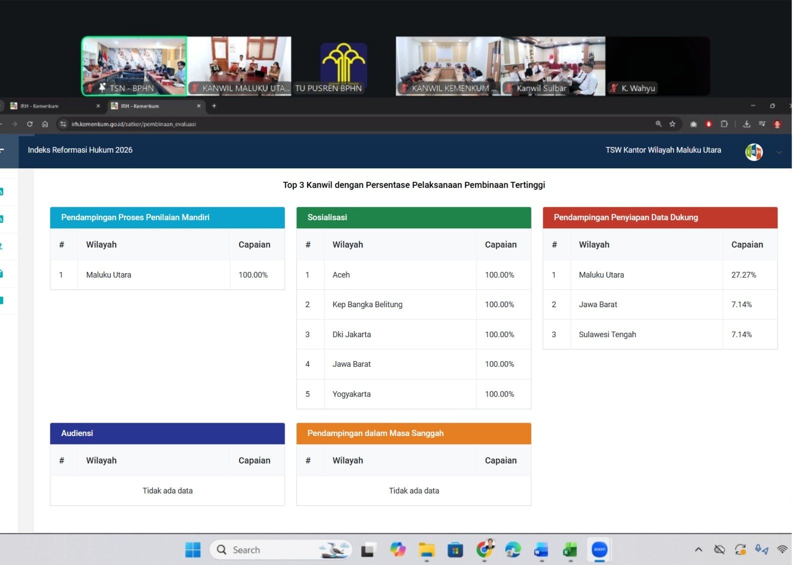 Selanjutnya, TSN BPHN memaparkan materi penggunaan aplikasi IRH, mulai dari akun yang digunakan oleh masing-masing TSW, penjelasan fitur-fitur yang tersedia, hingga informasi yang ditampilkan dalam aplikasi. Dalam sesi tersebut juga ditampilkan peringkat pelaksanaan tahapan IRH antar kanwil, dimana Kanwil Kemenkum Malut berada pada peringkat tiga besar dengan capaian proses pelaksanaan sebesar 45,45 persen.