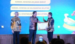 Jakarta – Kantor Wilayah (Kanwil) Kementerian Hukum (Kemenkum) Maluku Utara meraih penghargaan video terbaik mars kekayaan intelektual berbasis musik tradisional. Kakanwil Kemenkum Malut, Budi Argap Situngkir menerima penghargaan secara langsung yang diserahkan oleh Menteri Hukum, Supratman Andi Agtas, didampingi Direktur Jenderal Kekayaan Intelektual (Dirjen KI), Razilu.