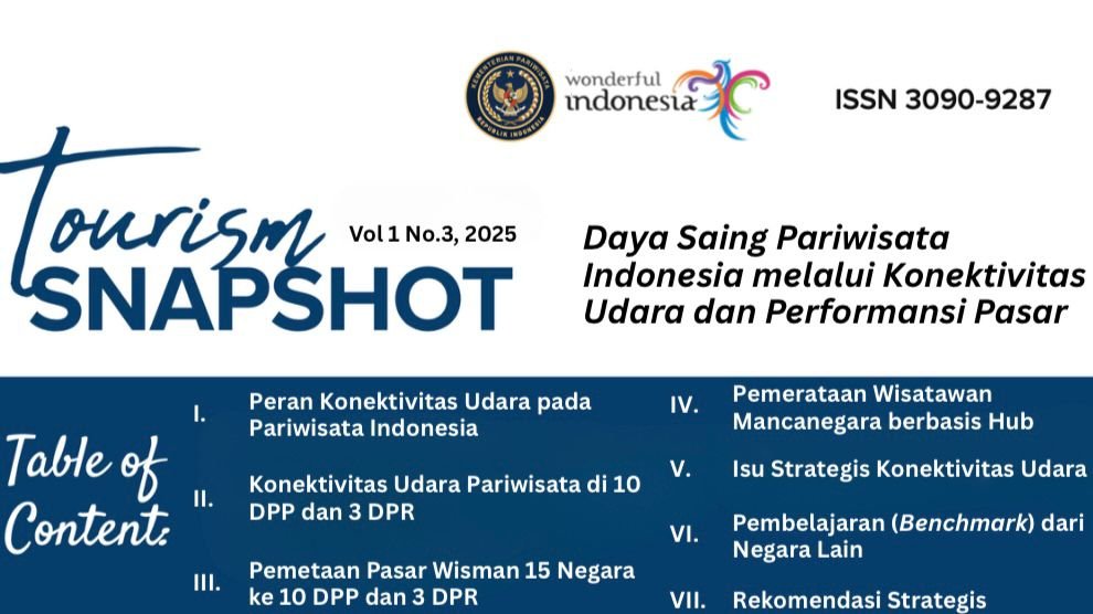 Kementerian Pariwisata (Kemenpar) mempublikasikan kajian terbaru mengenai penguatan pariwisata Indonesia melalui pemanfaatan konektivitas udara dalam publikasi ilmiah Tourism Snapshot Vol. 1 No. 3 Tahun 2025.