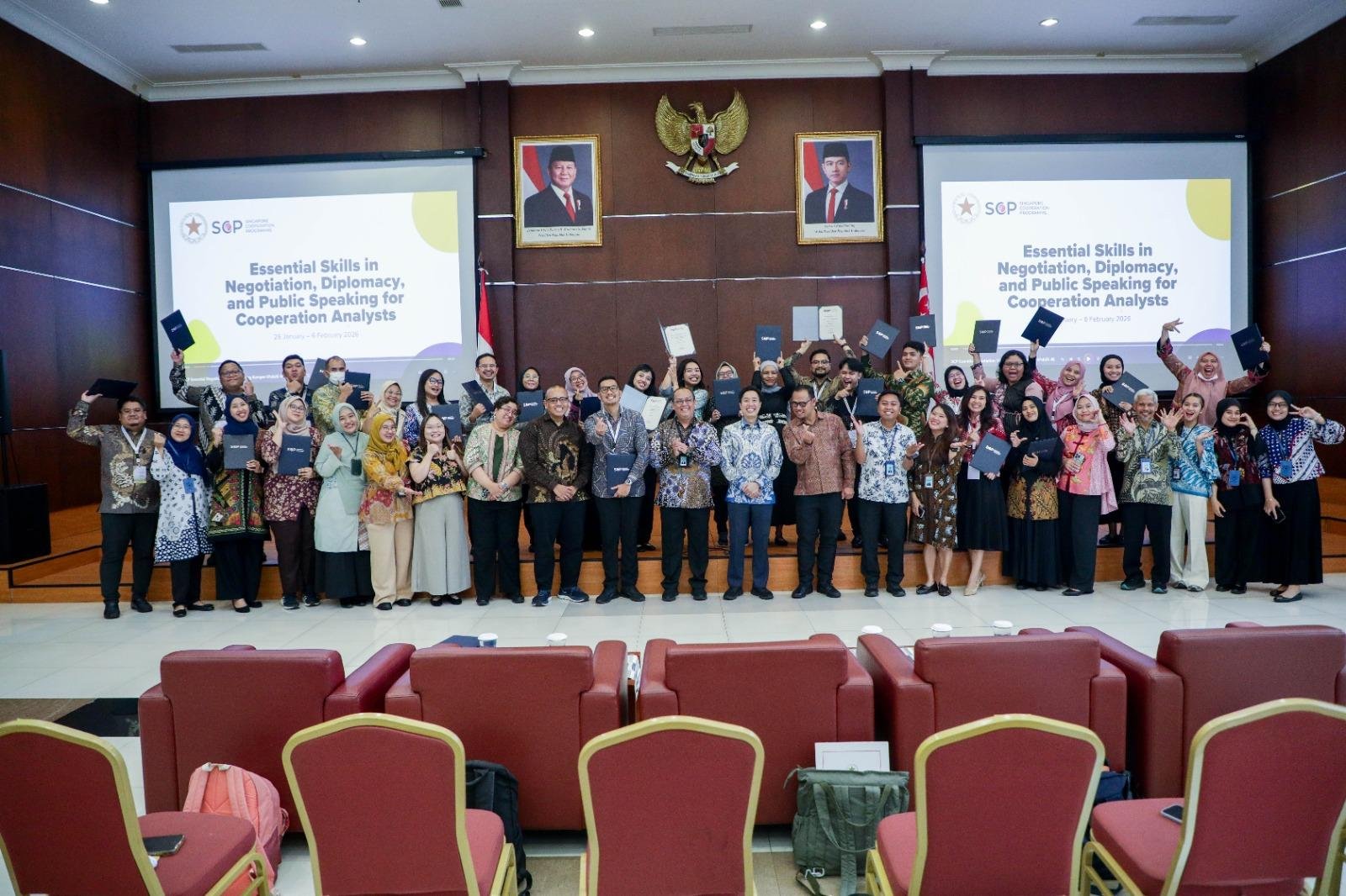 Kementerian Sekretariat Negara (Kemensetneg) resmi menutup kegiatan Singapore Country Training bertajuk Essential Skills in Negotiation, Diplomacy, and Public Speaking bagi para Analis Kerja Sama. Kegiatan ini berlangsung di Pusat Pengembangan Kompetensi Aparatur Sipil Negara (PPKASN) Kemensetneg, Jakarta, pada Jumat (06/02/2026).