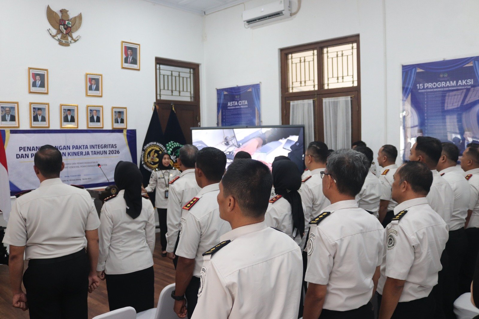 Lembaga Pemasyarakatan (Lapas) Kelas I Tangerang menghadiri kegiatan Penandatanganan Pakta Integritas dan Perjanjian Kinerja Tahun 2026 yang diselenggarakan oleh Kantor Wilayah Direktorat Jenderal Pemasyarakatan (Ditjenpas) Banten, Senin (12/1). Kegiatan ini menjadi langkah strategis dalam memperkuat komitmen jajaran pemasyarakatan untuk mewujudkan tata kelola pemerintahan yang profesional, transparan, dan berintegritas, sekaligus penegassan arah pelaksanaan tugas dan fungsi pemasyarakatan sepanjang tahun 2026.
