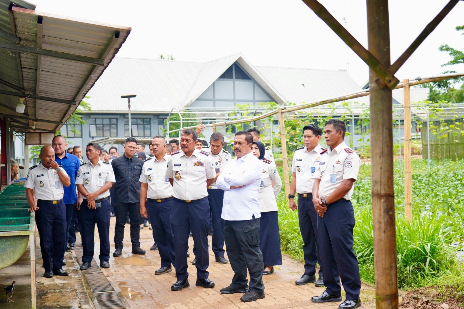 Rombongan meninjau progres peternakan ayam petelur yang menjadi program unggulan pembinaan. Selain itu, area lahan Pembinaan yang ada di Lapas Terbuka Ciangir turut ditinjau sebagai potensi pengembangan pertanian dan peternakan terpadu dalam mendukung ketahanan pangan nasional.