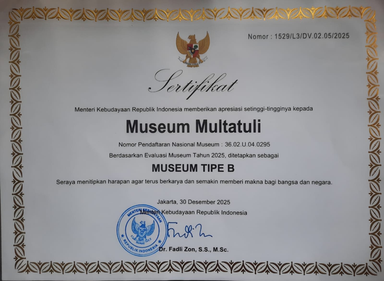 Museum Multatuli di Kabupaten Lebak kembali mencatat prestasi penting di tingkat nasional setelah ditetapkan sebagai Museum Tipe B oleh Kementerian Kebudayaan Republik Indonesia melalui hasil Evaluasi Museum Tahun 2025. Penetapan ini diumumkan Kamis (22/1/2026) dan disertai sertifikat resmi yang ditandatangani oleh Menteri Kebudayaan RI.