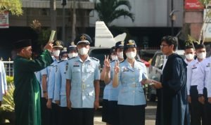 CILEGON – 17 Orang Calon Pegawai Negeri Sipil (CPNS) di Lingkungan Lembaga Pemasyarakatan (Lapas) Kelas IIA Cilegon mengikuti kegiatan pelantikan dan pengambilan sumpah jabatan yang di gelar di lapangan Kantor Wilayah Kementerian Hukum dan HAM Banten.