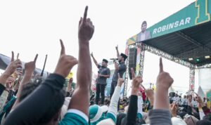 CILEGON – Calon Wali Kota dan Wakil Wali Kota Cilegon nomor urut satu, Robinsar dan Fajar Hadi Prabowo menghadiri kampanye akbar di Lapangan Bukit Cilegon Asri, Kelurahan Bagendung, Kecamatan Cilegon, Kota Cilegon, Banten. Kampanye akbar dihadiri oleh puluhan ribuan massa,