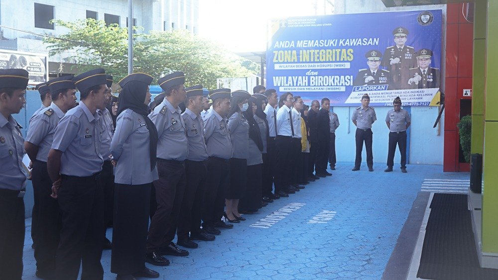“Kanwil Kemenkum Maluku Utara telah meraih predikat zona integritas WBK (Wilayah Bebas dari Korupsi). Tahun depan kita harus dapat meraih predikat WBBM sebagai bentuk komitmen memberikan pelayanan yang prima, cepat, dan mudah kepada publik,” ungkap Argap Situngkir saat memimpin apel pagi, Senin (20/10).
