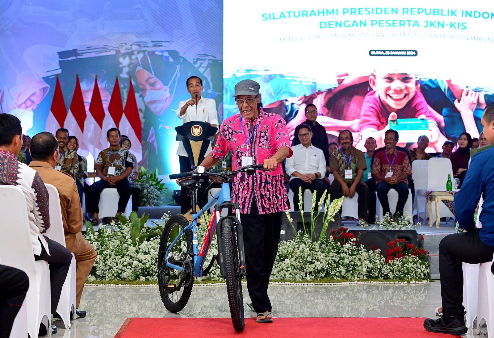 Presiden Joko Widodo didampingi Ibu Iriana Joko Widodo bersilaturahmi dengan para penerima bantuan iuran Badan Penyelenggara Jaminan Sosial (BPJS) Kesehatan pada Selasa, 23 Januari 2024. Dalam acara silaturahmi yang digelar di Graha Larasati, Kabupaten Blora, Provinsi Jawa Tengah, Presiden ingin memastikan bahwa Kartu Indonesia Sehat (KIS) atau BPJS sangat bermanfaat bagi rakyat.