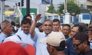 TEGAL— Sekjen Partai Gerindra sekaligus Wakil Ketua Tim Kampanye Nasional, Ahmad Muzani, menghadiri deklarasi dukungan Solidaritas Nelayan Indonesia (SNI) kepada pasangan capres cawapres nomor urut 2, Prabowo-Gibran. Deklarasi dihadiri ribuan nelayan dan masyakarat di Pelabuhan Perikanan Pantai Tegalsari, Kota Tegal, Minggu (17/12).