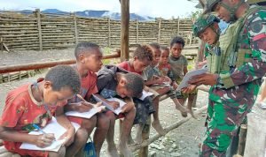 Mege’abume – Prajurit Satgas Pamtas Mobile RI-PNG Yonif 323/BP Kostrad dari Pos Pintu Jawa, menebarkan motivasi dan semangat belajar kepada anak-anak di sekitaran Pos dengan membuka kegiatan belajar di Pos, Mege’abume, Distrik Sinak, Kab Puncak, Papua, Jum’at (01/03/2024)