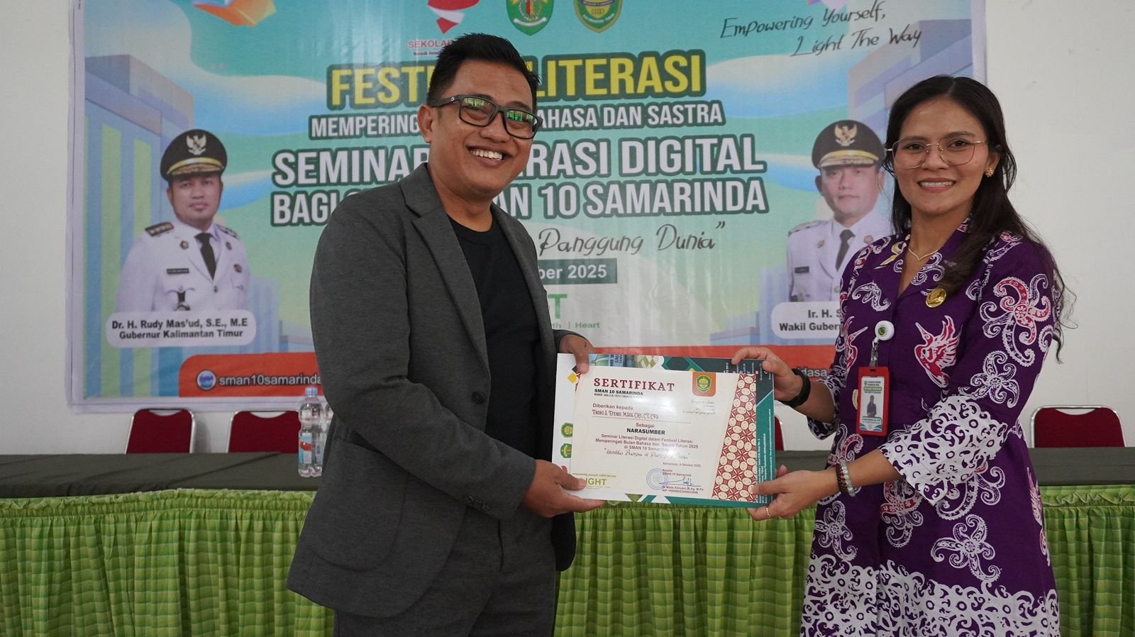 Samarinda, 9 Oktober 2025 — Dalam rangka memperingati Bulan Bahasa dan Sastra, SMA Negeri 10 Samarinda menggelar Seminar Literasi Digital bagi peserta didik kelas X di Ruang Kesenian sekolah, Kamis (9/10/2025). Kegiatan ini menjadi bagian dari rangkaian Festival Literasi Siswa yang rutin diselenggarakan setiap tahun untuk menumbuhkan semangat membaca, menulis, berpikir kritis, serta membangun integritas akademik di kalangan pelajar.