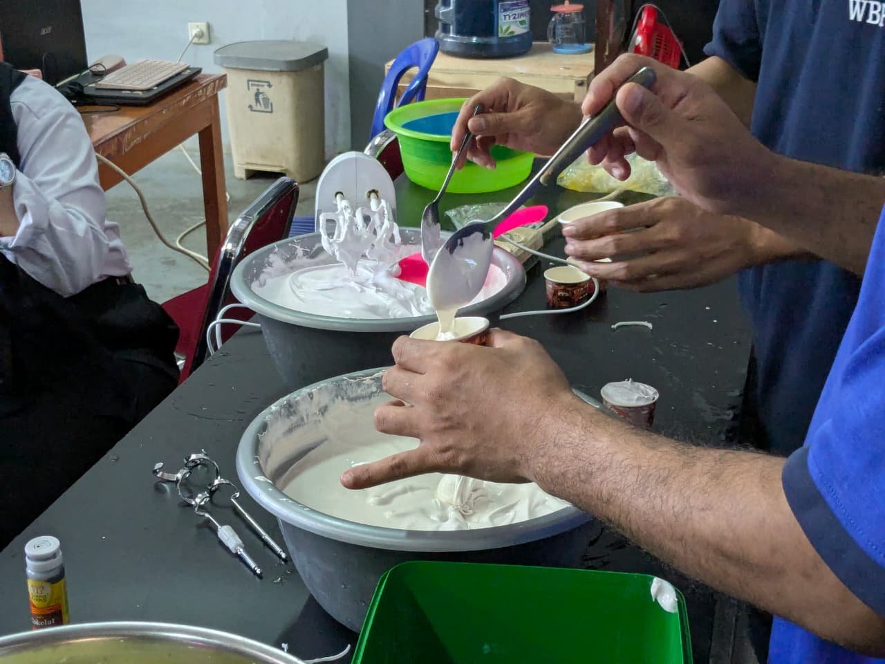 Pada hari kedua pelatihan, warga binaan melanjutkan proses pembuatan es krim dengan mengaduk kembali adonan yang sebelumnya telah disimpan dalam freezer. Proses ini dilakukan untuk menghasilkan tekstur es krim yang lebih lembut dan merata. Setelah itu, peserta pelatihan menambahkan berbagai varian perasa (flavor) pada adonan es krim sesuai dengan jenis produk yang akan dibuat.