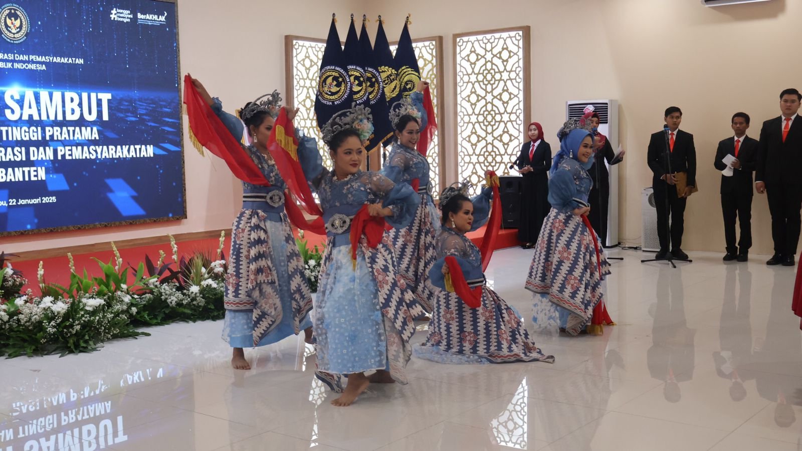 Lima Warga Binaan Pemasyarakatan (WBP) dari Lapas Perempuan Kelas IIA Tangerang memukau hadirin dengan penampilan tari Moending Kahareup dalam acara pisah sambut Pimpinan Tinggi (Pimti) di lingkungan Kantor Wilayah Direktorat Jenderal Pemasyarakatan (Kanwil Ditjen PAS) Banten. Acara tersebut digelar di Aula Kanwil.